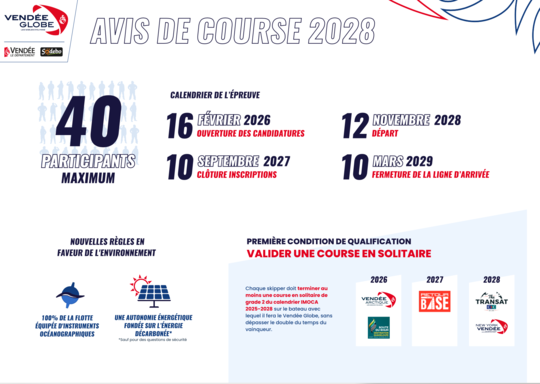 Die 12. November 2028 in Les Sables d'Olonne werden maximal 40 Teilnehmer zu einer Einhand-Weltumsegelung ohne Zwischenstopps und ohne Unterstützung starten. Die Vendée Globe feiert dann ihre 40 Jahre und seine 11. Ausgabe . Aber um an der Startlinie zu stehen, ändern sich die Regeln, um sportliche Fairness, Umweltengagement und einen klaren Qualifikationsprozess zu gewährleisten.
