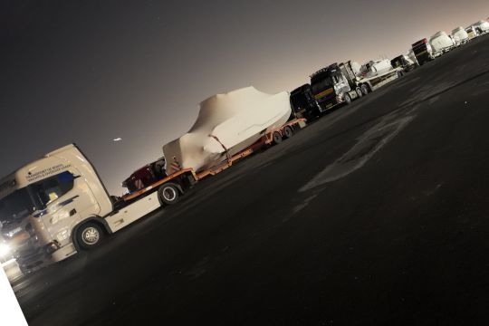 Sobald die Konvois auf dem Parkplatz des Parc des Expositions du Bourget angekommen sind, warten sie. Die Schiffe fahren nicht alle gleichzeitig ein: Je nach Anordnung in den Hallen wird eine bestimmte Reihenfolge vorab festgelegt. Die Kräne positionieren sich bis auf wenige Zentimeter genau über dem Trailer.