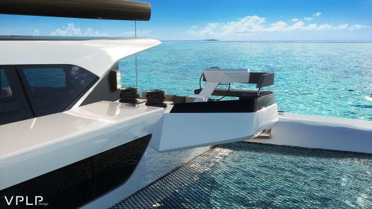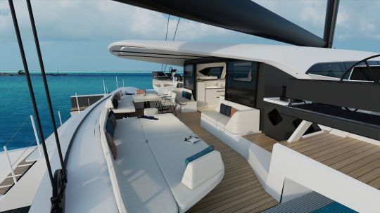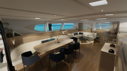Dieser Trimaran begnügt sich nicht damit, Zahlen aneinanderzureihen. An Bord können die 123 m² Wohnfläche ganz individuell gestaltet werden. Die 12 m² große Eignersuite mit direktem Zugang zum Deck, das 25 m² große Cockpit und die 160 m² großen Trampoline machen das Boot zu einem echten Loft auf dem Wasser. Alles wurde so konzipiert, dass der Verkehr fließend, die Bewegungen natürlich und die Manöverposten zugänglich sind.