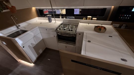 Die Bewegung rundherum ist fließend und die U-Form schützt den Koch gut. Diese Anordnung ist für diejenigen gedacht, die wirklich an Bord leben, nicht nur, um die Teller am Ankerplatz oder im Hafen herauszuholen.