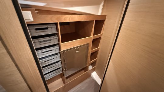 Bei einigen Versionen wird eine der Achterkabinen durch einen Technikraum ersetzt, in den eine Werkstatt, zusätzliche Batterien oder eine Waschmaschine integriert werden können. Eine echte Option, die für Langstreckensegler nützlich ist.