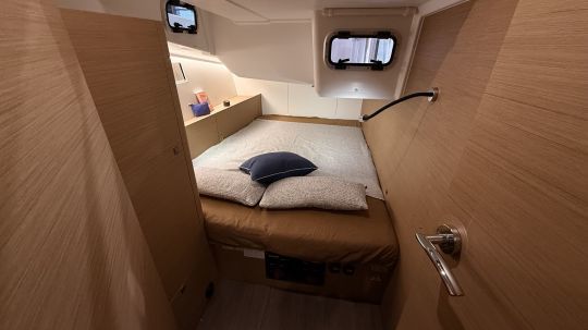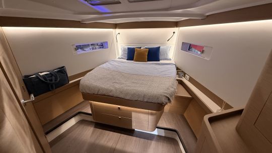 Die auf der Messe besichtigte Version bestand aus drei Kabinen mit einer vorderen Eignerkabine. Das zentrale Bett ist von beiden Seiten zugänglich, es gibt viele und gut platzierte Staumöglichkeiten und die vordere private Nasszelle umfasst eine separate Dusche. Hinten sind die Kabinen geräumig und gut belüftet, mit einer Öffnung zum Cockpit.