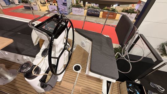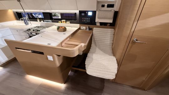 Jeanneau bietet einen Kartentisch mit einem besonderen Navisitz an. Er lässt sich ausziehen und in ein Sofa/eine Leselampe verwandeln, mit sogar einem kleinen Kopfstützenkissen oben. Im Wohnzimmer ausprobiert, scheint dies sinnvoll zu sein. Die Nutzung auf See wird sich zeigen.
