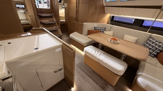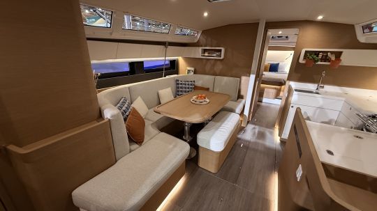 Die Holzvertäfelung ist schlicht, ganz im Sinne von Jeanneau: kein protziger Luxus, keine standardisierten Möbel. Die Polsterung ist strapazierfähig, die Handläufe sind gut positioniert, und die indirekte Beleuchtung sorgt für einen diskreten Komfort.