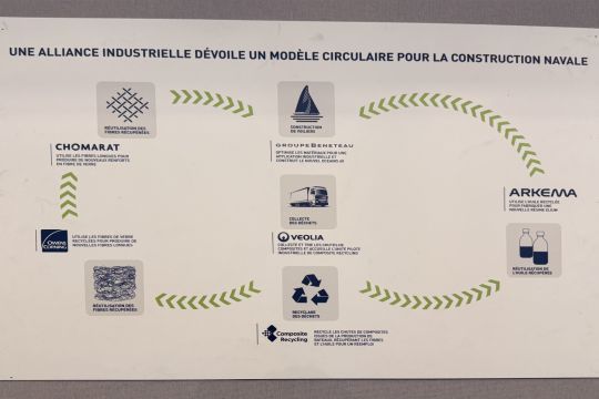 Anstatt mehrere Jahrzehnte zu warten, um die Recyclingfähigkeit von ausgedienten Booten zu testen, hat die Beneteau-Gruppe beschlossen, mit einem kontrollierteren Fluss zu beginnen: den Abfällen, die bei der Herstellung anfallen. Etwa 10% bis 15% des Materials, das für die Herstellung eines Rumpfes verwendet wird, gehen verloren: Harz, Verstärkungen, Ausschnitte für Bullaugen oder Luken...