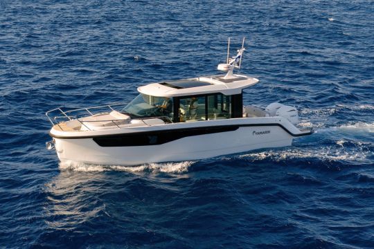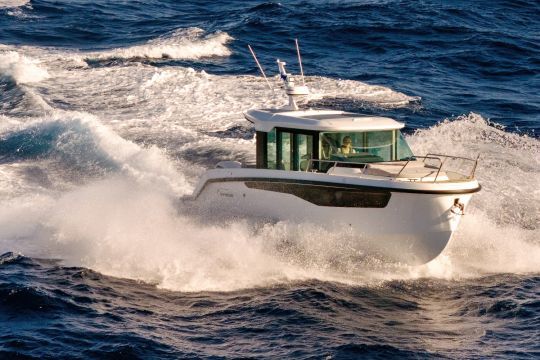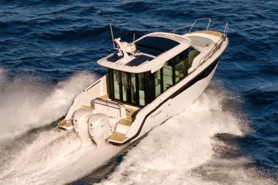 Die Werft bietet ausschließlich einen Antrieb mit doppelt montierten Yamaha-Außenbordmotoren an. Es sind drei Konfigurationen vorgesehen, 2x250 PS, 2x300 PS oder 2x350 PS. Diese Wahl richtet das Programm eindeutig auf hohe Reisegeschwindigkeiten und eine komfortable Leistungsreserve auch bei voller Beladung aus.