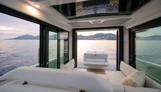 Die Aura Cabin ist so konzipiert, dass sie von der Nutzung als Nutzboot in nördlichen Breitengraden zu einer eher hedonistischen Navigation in wärmeren Gefilden übergehen kann. In der Nordsee oder in den skandinavischen Schären bilden das geschlossene Steuerhaus, die seitlichen Schiebetüren und die faltbare Hecktür einen schützenden Raum. Der Verkehr findet geschützt statt, mit einer angekündigten 360-Grad-Rundumsicht.
