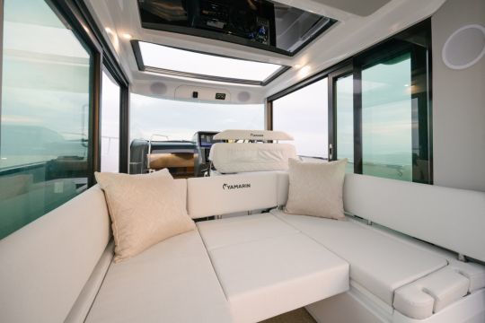 Mit einer Länge von 10,40 m und einer leistungsstarken Doppelmotorisierung steht die Aura Cabin eindeutig an der Spitze der Produktpalette bei Yamarin. Die Werft präsentiert dieses Modell als eine Synthese aus ihrem nordischen Know-how und einer Öffnung für mehr internationale Verwendungszwecke.