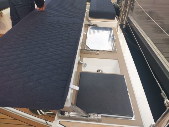 Die Badeplattform beeindruckt durch ihre Größe, sie ist fast drei Meter breit und schließt das Heck komplett ab. Sie erleichtert den Zugang zum Wasser, zu den Beibooten und zu den Hafenmanövern. Die Außenküche befindet sich direkt darüber und sorgt für angenehme Momente am Ankerplatz.