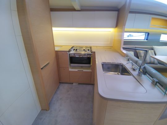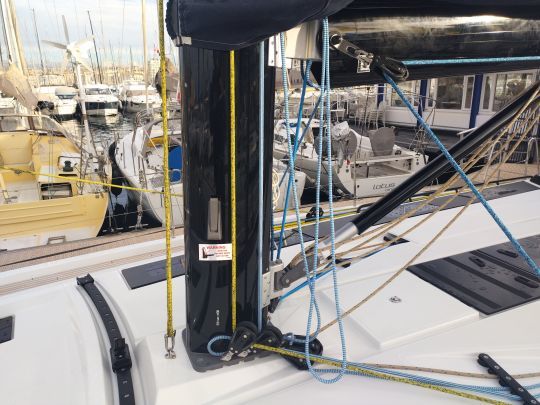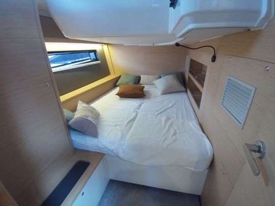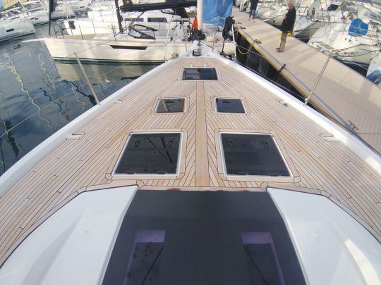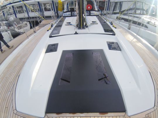 Auf dem Vorschiff ist die Selbstwendefock auf einer Schiene serienmäßig, während eine überlappende Genua als Option angeboten wird, wobei die Schotpunkte an der Kabinenstruktur angebracht sind. Diese Wahl lässt dem Eigner die Freiheit, das Boot für einfache oder anspruchsvolle Fahrten zu nutzen.