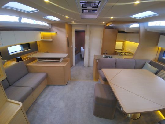 Unter Deck setzt die Dufour 54 auf natürliches Licht, helle Oberflächen und eine gute Belüftung. Die zahlreichen Decksluken sorgen für eine angenehme Luft- und Lichtzufuhr sowohl beim Ankern als auch beim Segeln.
