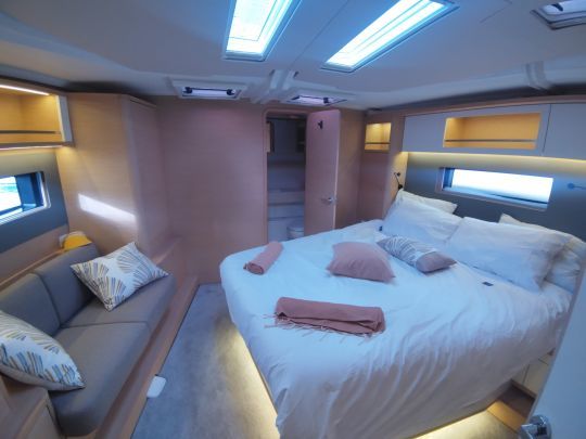 Die vordere Kabine ist in zwei verschiedenen Versionen erhältlich. Die Master Suite bietet ein schräg angeordnetes Inselbett und ein Badezimmer mit separater Dusche im Bug. Die Master Cabin behält ein zentrales Bett mit separater Dusche und Toilette bei. Zwei unterschiedliche Ansätze, je nachdem, ob man mehr Wert auf Geräumigkeit oder Symmetrie legt.