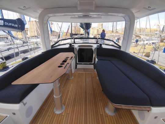 Das Cockpit nimmt eine Konfiguration mit zwei Tischen an, eine Anordnung, die einen durchgehenden Mittelgang freigibt. Die Tischplatten können abgesenkt und mit Kissen ergänzt werden, um geräumige Sonnenliegen zu bilden, die sowohl beim Ankern als auch bei Zwischenstopps genutzt werden können.