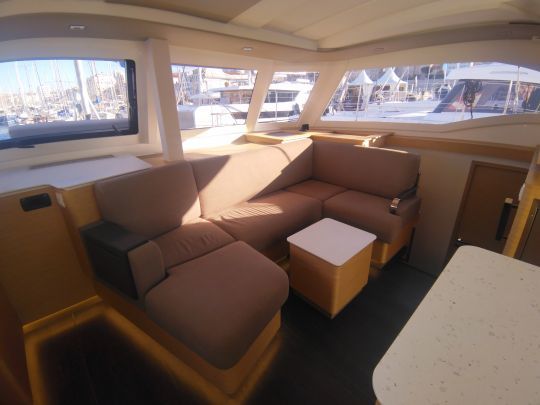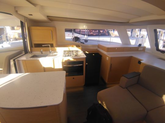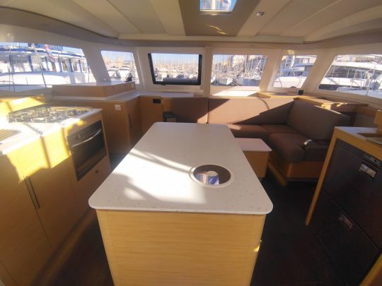 Die dreiflügelige Fensterfront verwischt weitgehend die Grenze zwischen Cockpit und Salon. Die Küche ist um eine zentrale Insel herum angeordnet, die den Raum strukturiert und gleichzeitig die Bewegung an Bord erleichtert. Die Arbeitsfläche ist großzügig, die Stauräume sind zahlreich und die natürliche Belüftung wird durch die großen Schiebetüren verstärkt.