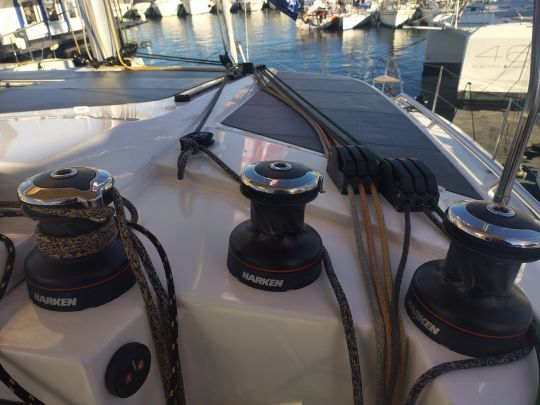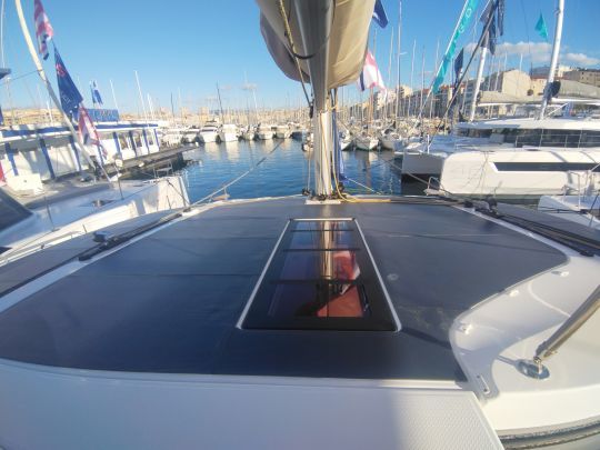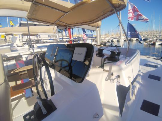Der halbintegrierte Steuerstand bleibt der DNA der Werft treu. Er ist gut geschützt und bietet eine gute Sicht auf die Segel, die Wasserfläche und die Crew. Alle Manöver sind in Reichweite: Großsegel, Schoten, Reffs, Gennaker und die üblichen Trimms.