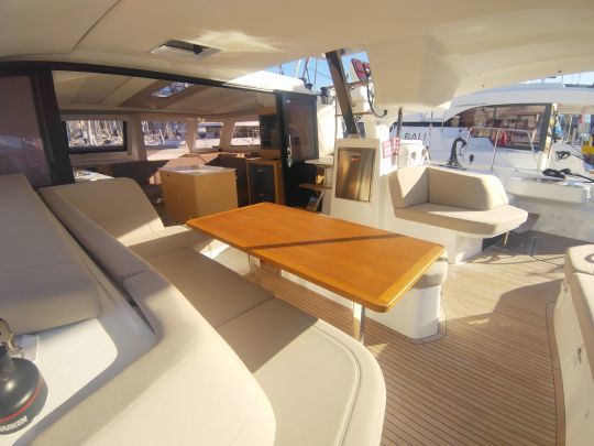 Das Heckcockpit konzentriert einen großen Teil der Überlegungen, die für dieses Modell angestellt wurden. Das Ziel ist klar, mehr Sitzgelegenheiten zu schaffen und die Geselligkeit zu fördern. Der große Tisch in der Mitte bietet dank einer Verlängerung Platz für bis zu zehn Personen. Die Sitzbänke sind tief, mit einer Asymmetrie auf der Backbordseite, die sowohl den Komfort als auch den Stauraum unter den Sitzen erhöht.