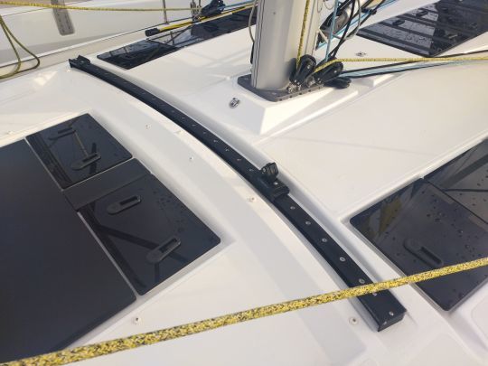 Das als Option angebotene Hardtop verändert die Nutzung. Der Schutz ist bei Amwind- und Windverhältnissen spürbar und die Dachverglasung verbessert die Sicht auf die Segel vom Cockpit aus. Der Ausschnitt des Hardtops ist so gestaltet, dass es sich ohne Knicke bewegen lässt, während man die Trimmung im Auge behalten kann.