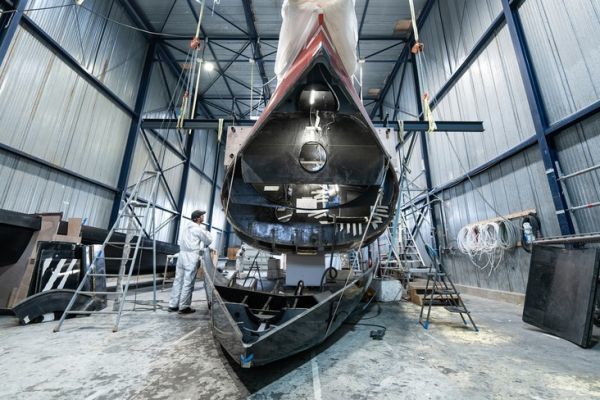 Diese Vorbereitungsphase ermöglicht es, die Endmontage so weit wie möglich vorwegzunehmen. Die eigentliche Werftarbeit beginnt nach der Rückkehr von der Transat Café L'Or. Ab Mitte Dezember machen sich die Teams an das Zuschneiden des Karbons, ein langer und anspruchsvoller Vorgang, der über mehrere Wochen in einer durch Staub und Lärm belasteten Umgebung durchgeführt wird.