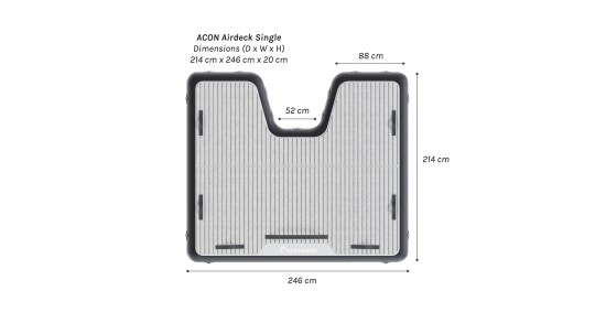 Um den Außenbereich zu vergrößern, bieten Yamarin und Acon eine aufblasbare, schwimmende Plattform an, die am Heckspiegel befestigt wird. Dieses Airdeck zielt darauf ab, einen zusätzlichen Bereich auf Wasserniveau zu schaffen, ohne strukturelle Veränderungen am Boot vorzunehmen.