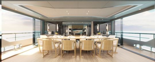 Der Trend bei großen Yachten ist klar: Die Zirkulation zwischen Innen und Außen soll flüssiger werden, Terrassen und Mehrzweckräume sollen vermehrt werden. Ein Beach Club, der vom Salon in ein Fitnessstudio oder einen Kinoraum umgewandelt werden kann, entspricht einer Logik der Nutzung, nicht nur des Images.