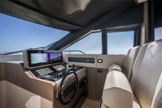 Die Flybridge ist 41 m² groß und über eine Treppe an Steuerbord vom Cockpit aus erreichbar. Bei dieser Größe handelt es sich um ein echtes Oberdeck, das Platz für einen Essbereich, eine Wet Bar mit Grill, Eismaschine und Kühlschrank sowie einen zweiten Steuerstand bietet.