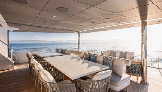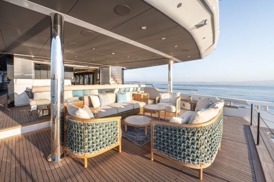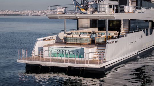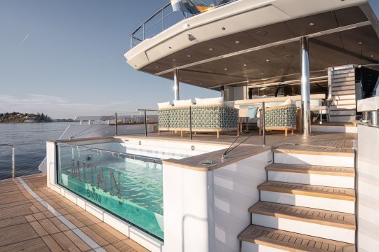 Das Heck konzentriert einen großen Teil des Konzepts. Drei Ebenen gehen vom Cockpit bis zur Badeplattform ineinander über. Von einem Essbereich geht es zu einem Loungebereich mit integriertem Pool und schließlich zu einem direkten Zugang zum Meer.