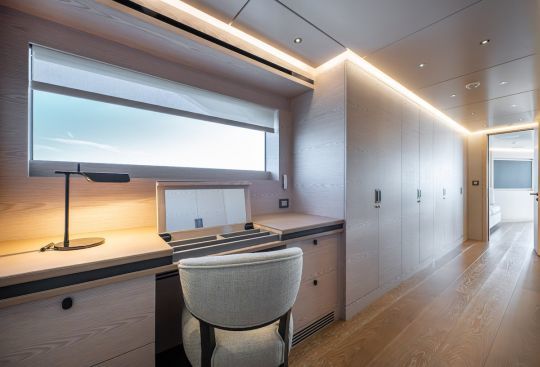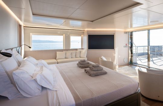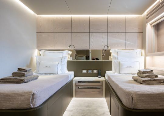 Der Innenplan bietet sechs Kabinen für zwölf Passagiere, mit einer ebenerdigen Eignersuite auf dem Hauptdeck. Zwei Kabinen bieten eine interessante Modularität. Sie können als Kinderzimmer, Büro oder zusätzliche Kabine genutzt werden.