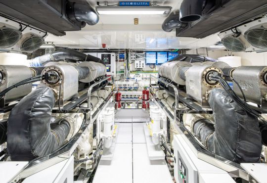 Der Antrieb basiert auf zwei 800 PS starken MAN-Motoren, die optional auf 900 PS aufgerüstet werden können. Diese Wahl ist für eine Yacht dieser Tonnage klassisch. Der Schwerpunkt liegt auf der Zuverlässigkeit und dem geringen Verbrauch bei mäßiger Geschwindigkeit.