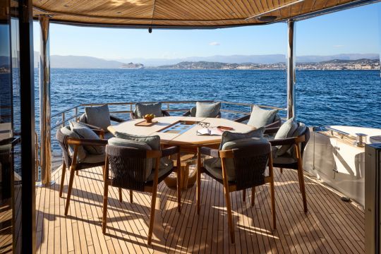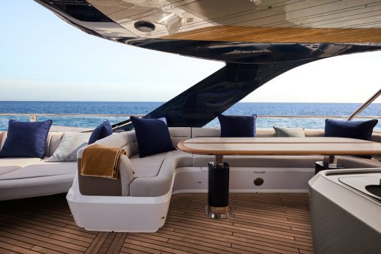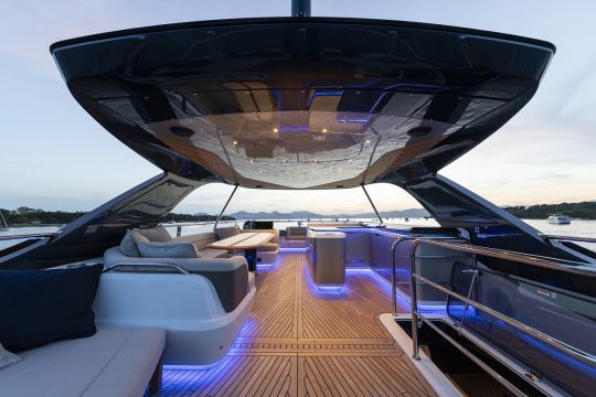 Die Werft behält ihr Beach-Mode-System mit klappbaren Schanzkleidern am Heck bei, wodurch die nutzbare Fläche am Ankerplatz vergrößert wird. Diese Vorrichtung verwandelt das Cockpit in eine zum Meer hin offene Plattform.