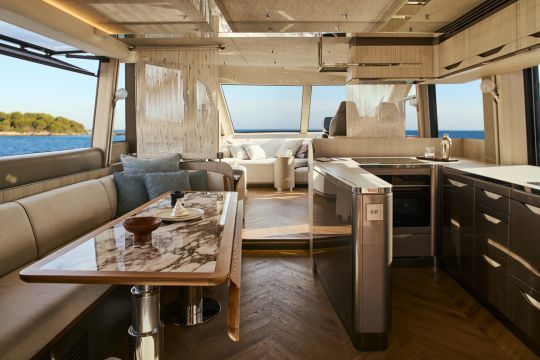 Die 620 Fly bietet verschiedene Gestaltungspaletten, fünf an der Zahl, mit denen Farbtöne und Materialkombinationen verändert werden können. Auch der Eigentümer kann einige Elemente mit Unterstützung der Werftteams anpassen.