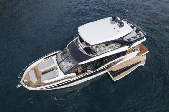 Der Decksplan bleibt der DNA der Werft treu, mit einer geräumigen Flybridge und übersichtlichen Verkehrsflächen. Die Yacht ist für Familien und kleine Besatzungen geeignet, die im Mittelmeer oder auf geschützten Gewässern kreuzen.