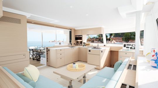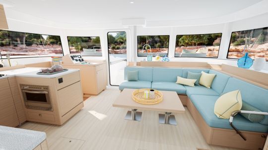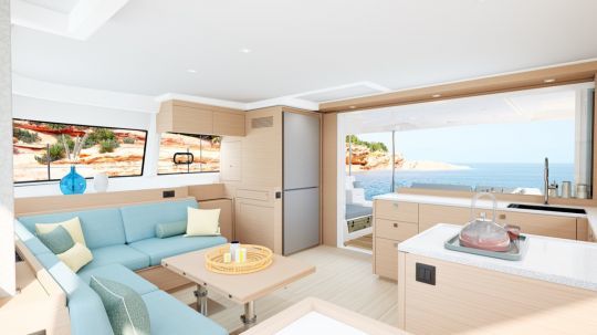 Das Innere bevorzugt offene Volumen und eine starke Helligkeit. Der Salon erstreckt sich dank der Öffnungen weit nach außen, was das Raumgefühl noch verstärkt. Die Kabinen sind mit Doppelbetten ausgestattet und verfügen über Öffnungen mit Meerblick, was den Komfort an Bord erhöht.