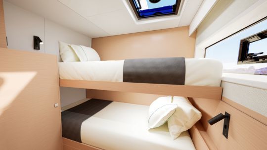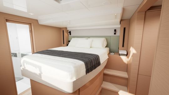 Die Eignerkabine integriert ein Badezimmer mit Doppelwaschbecken und gut verteilten Staumöglichkeiten. Der Smartroom im Backbordrumpf bietet eine interessante Modularität. Er kann als Kabine, Ankleidezimmer oder technischer Raum genutzt werden, was den unterschiedlichen Bedürfnissen von Eignern und Vermietern entgegenkommt.