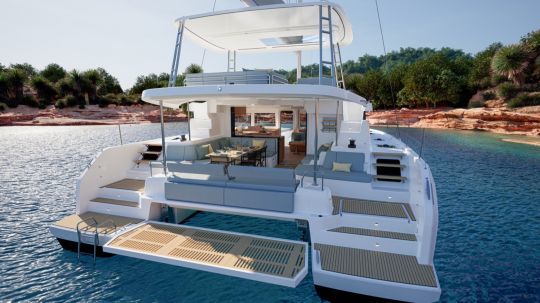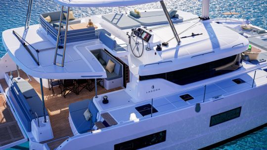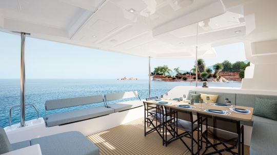Die Lagoon 47 stützt sich auf drei klar voneinander abgegrenzte Außenbereiche, die sich gegenseitig ergänzen. Das 16 m2 große Achtercockpit bleibt das Zentrum des Geschehens und bietet Platz für eine Familiencrew oder eine Chartergruppe. Die Zugänge zu den Schürzen erleichtern die Bewegungen beim Ankern.