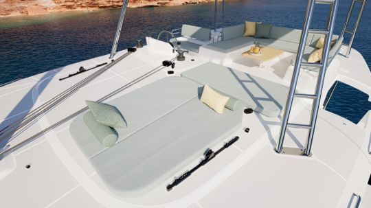 Das 12 m2 große vordere Cockpit wird zu einer echten Erweiterung des Salon. Sein direkter Zugang verändert seine Nutzung, es empfängt Momente der Ruhe oder der Wachsamkeit. Die Flybridge fügt eine dritte Ebene mit einem Entspannungsbereich und einem erhöhten Steuerstand hinzu, wodurch sich die Nutzfläche, aber auch der Windfang vergrößert.